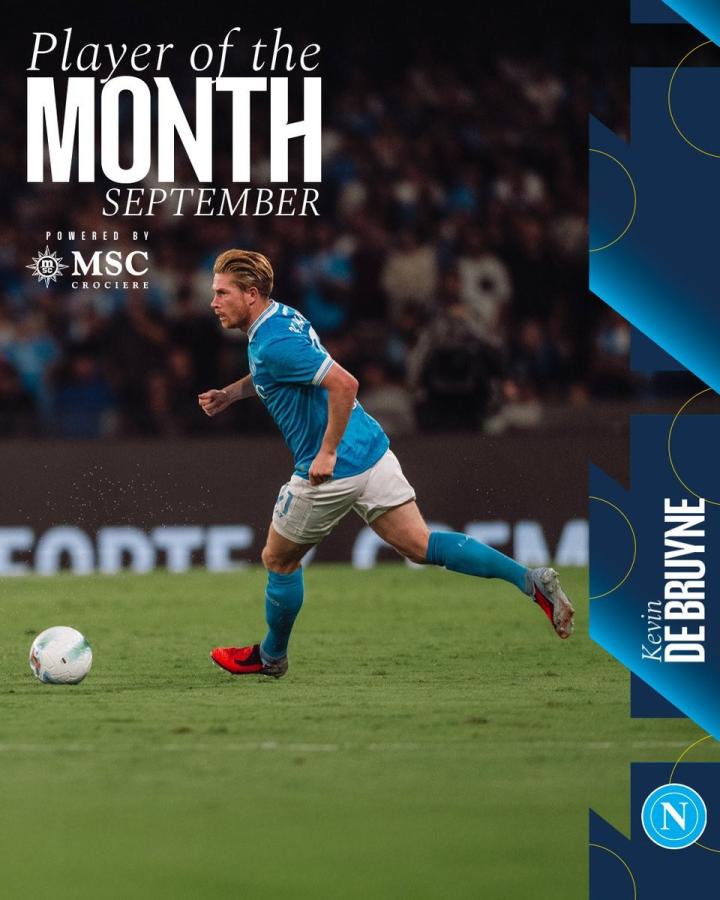 官方公告,德布劳内荣膺那不勒斯9月最佳球员称号。